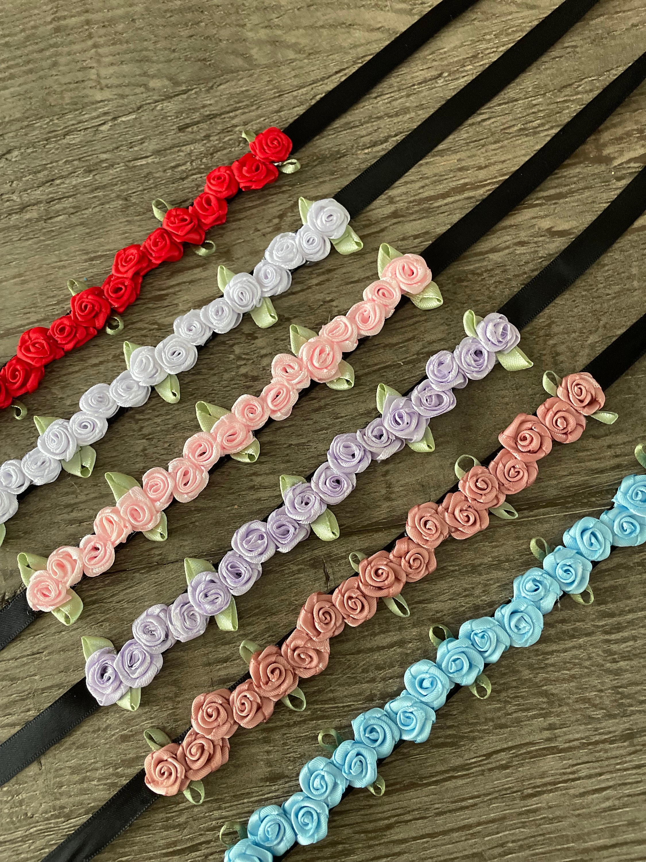 Handmade Floral Ballet BunWrap featuring assorted colorribbon roses on a black satin ribbon. Optional rhinestone or faux pearl embellishments available. See photos! Measures 3/8" wide by 26 inches long. BunFlowerz make great birthday gifts, stocking stuffers and performance gifts for your special dancer!
